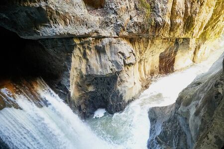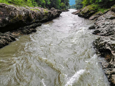 Top view of mountain river in gorge between rocks, water fast flowing