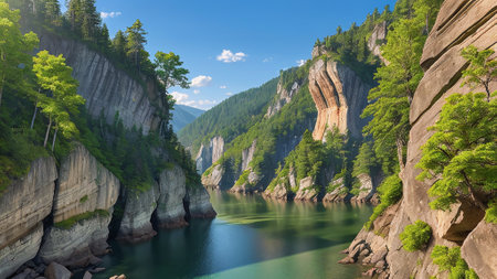 mysterious forest with cliffs and the river with bluish green water