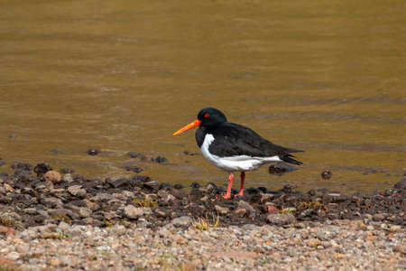 Eurasian oystercatcher (Haematopus ostralegus) a medium-sized bird with dark plumage with a red beak, the animal walks on the sandy beach on the river bank and looks for food.