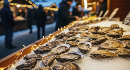 Glistening raw oysters displayed on a bed of crushed ice at a bustling outdoor winter market, illuminated by warm string lights.
