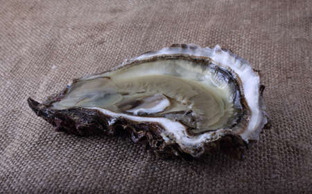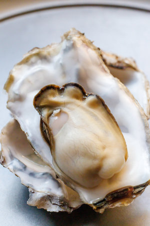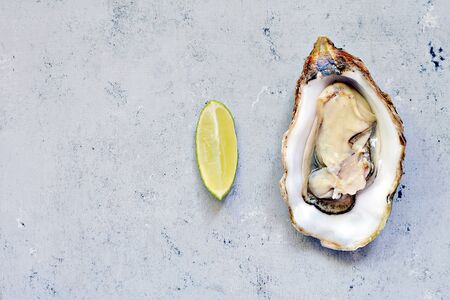 Oyster shell close up on a gray background. Seafood restaurant menu