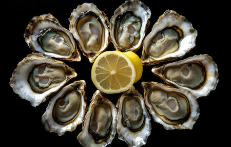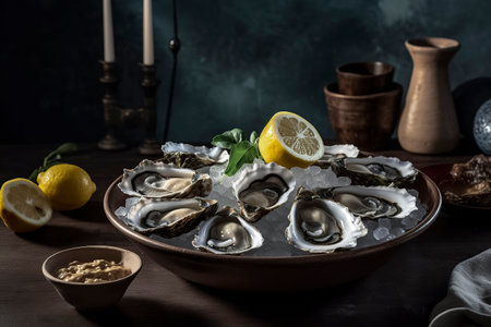 Fresh oysters on ice with lemon wedges a luxurious seafood delicacy served in a dark bowl