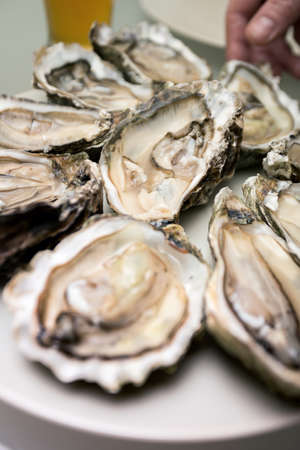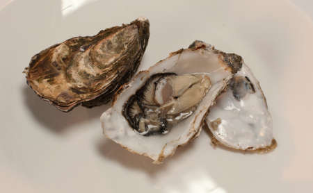 Fresh oyster. Raw fresh oyster is on white round plate, image isolated, with soft focus. Restaurant delicacy. Saltwater oyster.