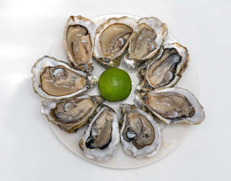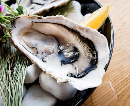 Fresh oysters close-up on a white plate, served table with oysters, lemon. Healthy sea food. Dinner of fresh oysters in a restaurant. Exquisite food.