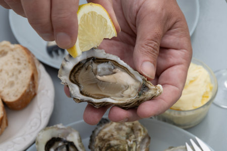 A man's hands squeezes fresh lemon juice onto an raw opened oyster, lifestyle food, ready to eat. Oyster dinner with champagne in restaurant.