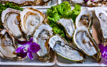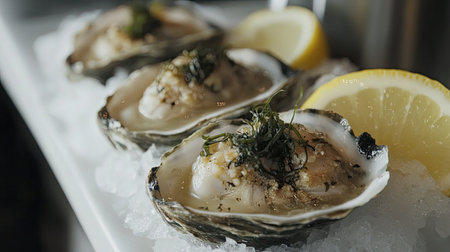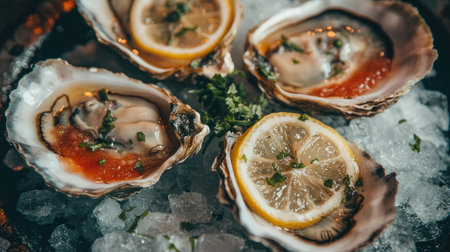 Indulge in a visually appealing presentation of fresh oysters served on ice with lemon slices and delicate garnishes, perfect for seafood lovers.