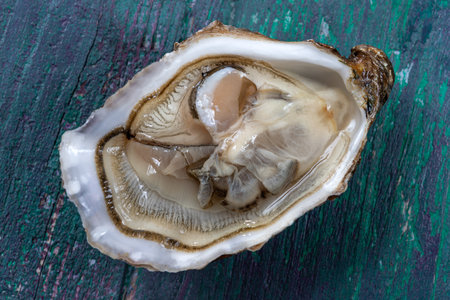 Close up of single oyester open on green wooden backgrond : gourmet macro food photography