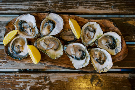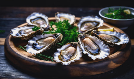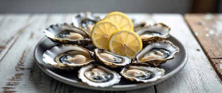 AI Generated. Plate of fresh oysters garnished with lemon slices served on a wooden table