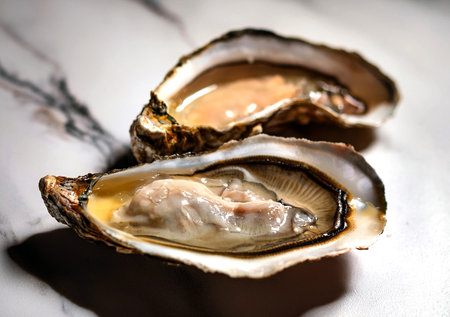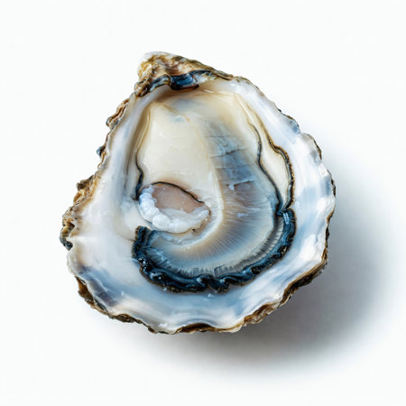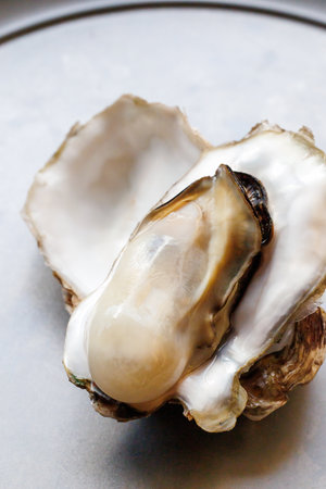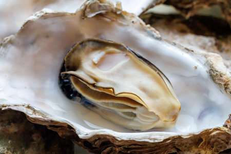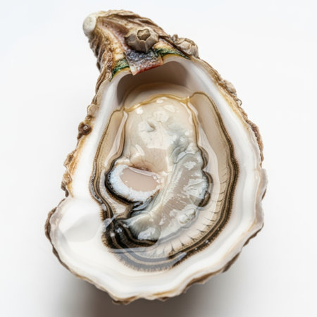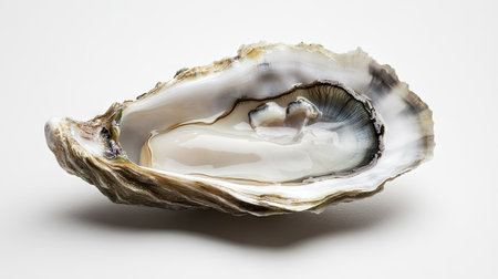 An open oyster shows its smooth shell and soft body, highlighting marine textures