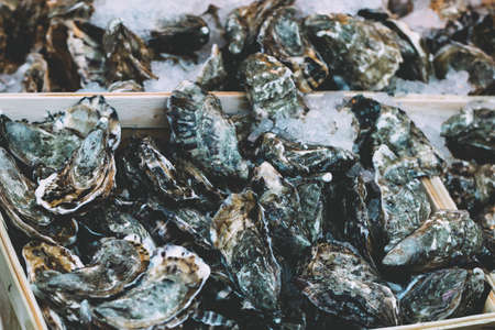 Big fresh oysters on ice. Seafood. Sale of oysters at a seafood market in Ostend, Belgium. Close-up.