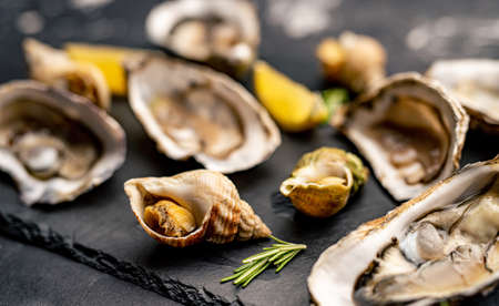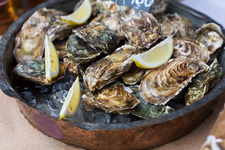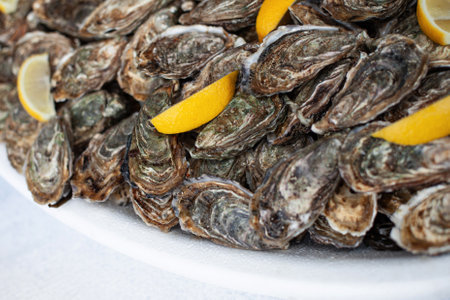 closed oysters with lemon, fresh oyster shell, mollusks in seafood market, aphrodisiac sea food restaurant, expensive restaurant menu