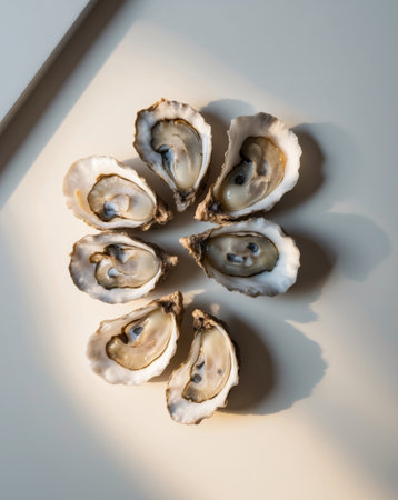 lots of oysters on a plate, in the style of nature-based patterns,flatlay