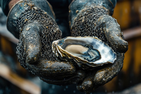 Skilled worker shows a freshly harvested oyster with details of hands covered in mud and protective gear in a coastal environment.