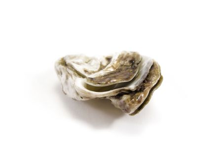 This image features a single fresh raw oyster resting on its shiny shell against a clean white background, ideal for food-related projects.