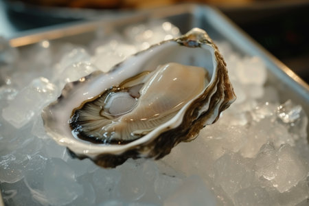 A stunning image of a freshly opened oyster resting on seaweed, surrounded by crushed ice. This visual captures the essence of coastal cuisine, perfect for food enthusiasts.