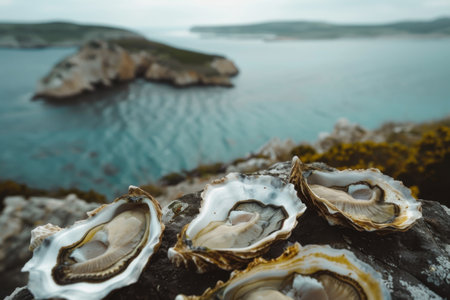 Oysters rest on a rocky outcrop, glistening under the soft morning light, overlooking a serene coastline with gentle waves lapping against the shore