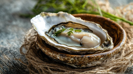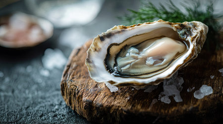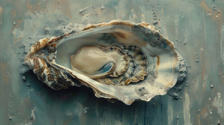 A rustic yet luxurious seafood image of an oyster shell cracked open, showcasing fresh, moist oyster meat inside.