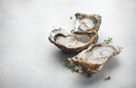 Oysters close up on ice, border design, open french oyster Fine de Claire, Healthy sea food. Oyster dinner in restaurant. Gourmet food, delicatessen. Copy space for your text, over