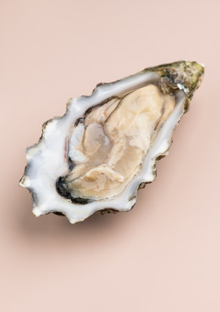 One oyster on beige background, macro shot of open fresh oyster. Gourmet food. Seafood. Macro shot, vertical image, top view, from above