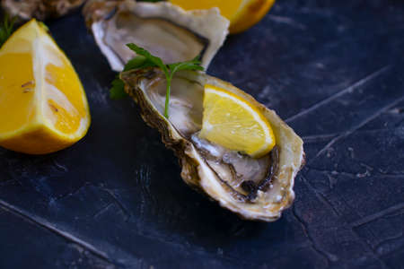 Elegant shot of Pacific oysters with lemon. Large, fresh raw seafood size number 1