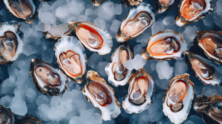 Fresh oysters laying on crushed ice. Seafood background. Top view