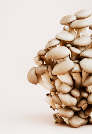A cluster of oyster mushrooms with their fleshy caps, gills and stipes on a light ocher background. There is a copy space in the upper portion of the photograph.