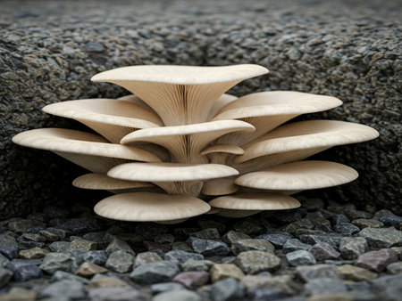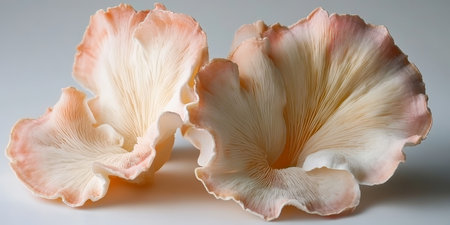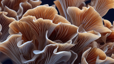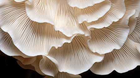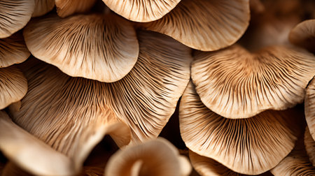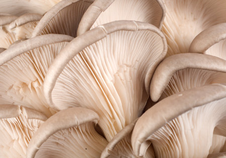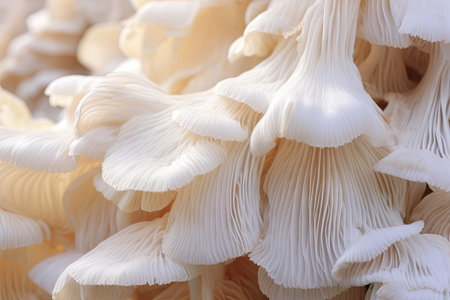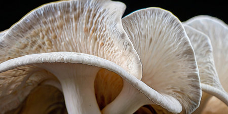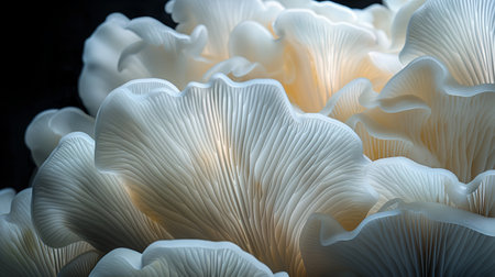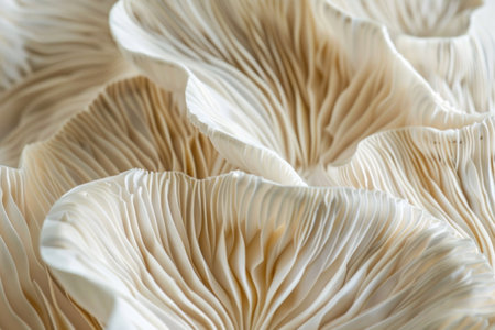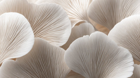 Oyster mushrooms display intricate gills in a close-up view. The soft lighting highlights their unique textures, creating an appealing natural scene for food lovers and chefs.