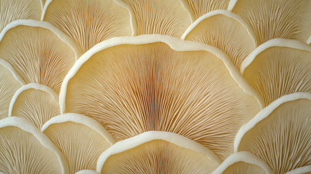 A symmetrical pattern of mushroom gills, rendered in a soft beige color with subtle texture details. The background is pure white to highlight the intricate and delicate structure of the mushrooms. --chaos 30 --ar 16:9 --v 6.1 Job ID: 29e89e6a-d752-4957-b5af-707293f1febb