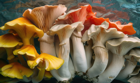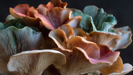 This image showcases a cluster of vibrant oyster mushrooms, presenting an array of colors from earthy oranges and pinks to muted greens. The composition highlights textures and intricate details of the fungi. Suitable for illustrations, culinary projects, or editorial content, the image is set against a dark background.