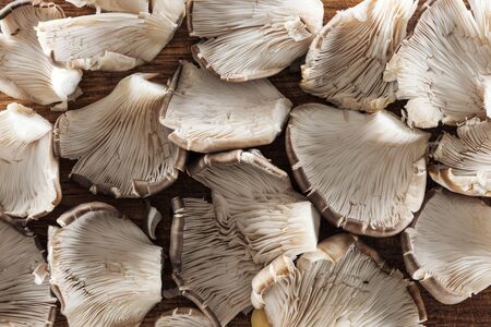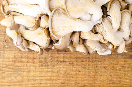 Oyster mushroom or Pleurotus ostreatus on wooden background. Top view. Close up