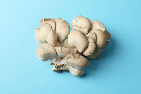 Fresh oyster mushrooms on blue background, top view