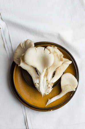 Pleurotus mushrooms on plate over white cloth, above view
