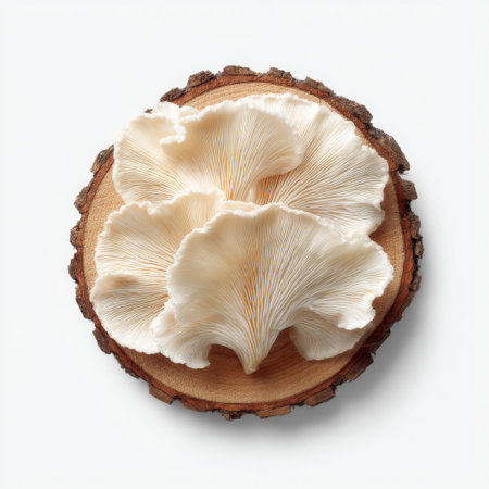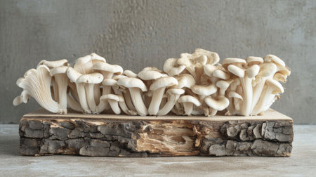 This captivating image features fresh oyster mushrooms elegantly arranged on a natural wooden slice, perfect for culinary presentations and food styling.