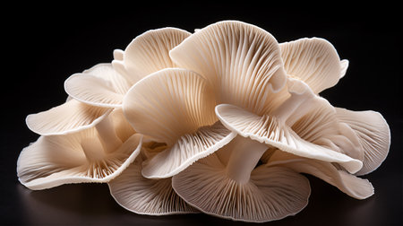 Isolated oyster fungi on an ebony backdrop.
