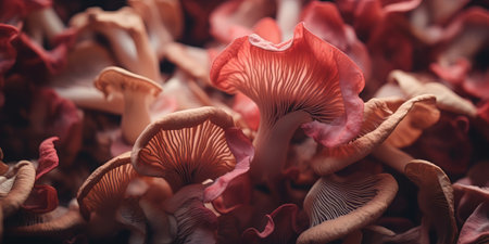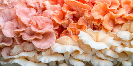 Wide Angle Pink And White Oyster Mushroom, Organic Background For Your Healthy Vegan Project.