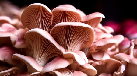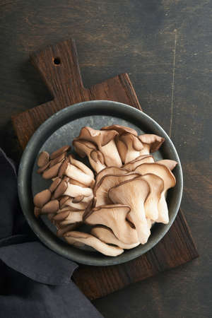 Oyster mushrooms on dark textured background. Macro shot for culinary and vegetarian design