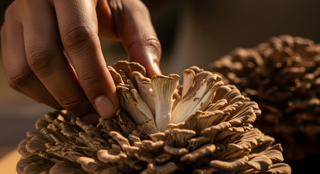 A close-up shot captures a person's hand gently touching the delicate, ruffled edges of a large cluster of fresh maitake mushrooms, also known as Hen of the Woods. The warm, natural light highlights the intricate texture of the mushroom and the skin of the hand. The image conveys a sense of foraging, nature, and fresh ingredients.