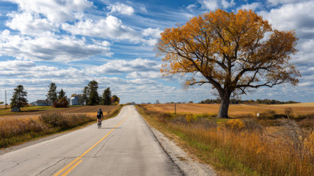 A cyclist rides on a quiet country road surrounded by golden fields and a towering tree with bright autumn leaves under a blue sky.
