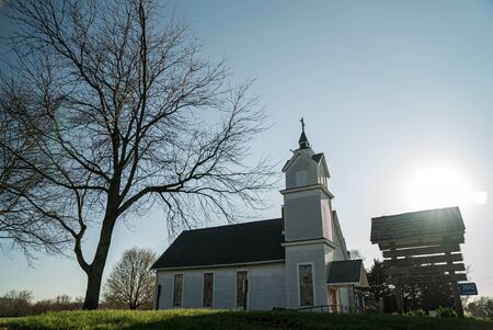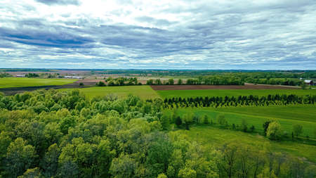 Springtime in Wisconsin out in the rural lands. View of fields, and trees to the horizon. A cloudy blue sky above