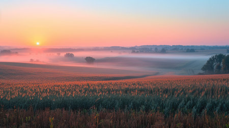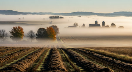 A serene rural landscape features rolling farm fields covered in a thick morning mist. In the distance, farm silos and barns rise above the fog, while harvested crop rows and autumn trees line the foreground in this peaceful countryside scene.