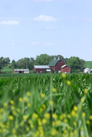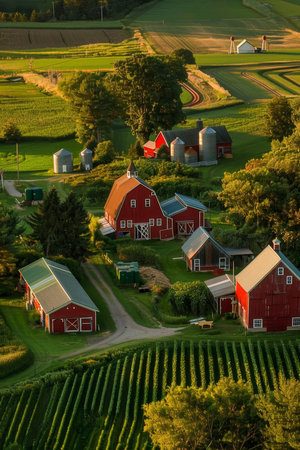 An overhead view of the Red Barn Farm and the American countryside. Farm fields.
