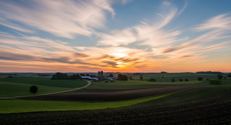 A classic rural farm landscape features a barn and silos nestled among rolling green fields under a spectacular sunset. The sky is filled with wispy clouds illuminated by orange and pink light, evoking a sense of country peace.