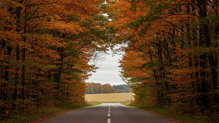 Autumn road through the forest. Beautiful autumn landscape. Autumn road.