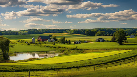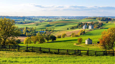 A picturesque countryside landscape featuring rolling hills and lush green fields, complemented by silos against a clear blue sky, exuding tranquility.