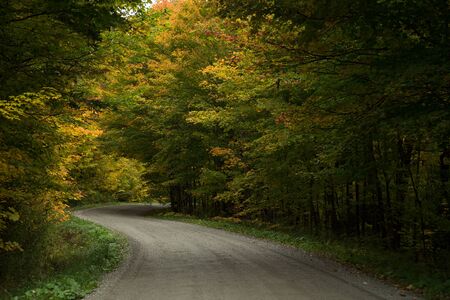 Tunnel of trees in autumn time along scenic byway M41 in Keweenaw peninsula in Michigan upper peninsula