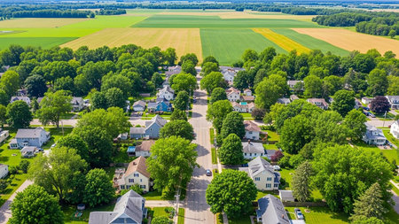 An aerial view of a charming American small town with tree-lined streets and residential houses, nestled amidst lush green farmland and vibrant agricultural fields.