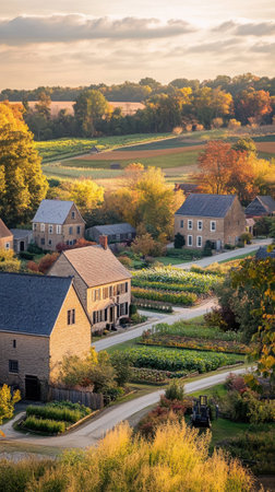 The Amana Colonies display charming stone houses surrounded by vibrant fall colors and rich farmland, creating a picturesque rural landscape during the golden hour.