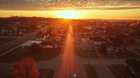 An aerial perspective showcases houses surrounded by greenery under an orange sunset. The composition includes roads, fences, and trees creating a picturesque environment. The lighting suggests an evening time, potentially suitable for travel or lifestyle content and various commercial applications.
