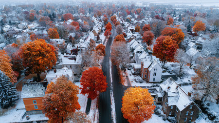 Brick showing panoramic aerial view of a town in autumn with red brick buildings and colorful trees keywords: aerial view, town, autumn, fall,...