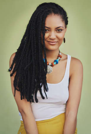 Draped in gorgeous dreads. Portrait of an attractive young woman posing against a green background.